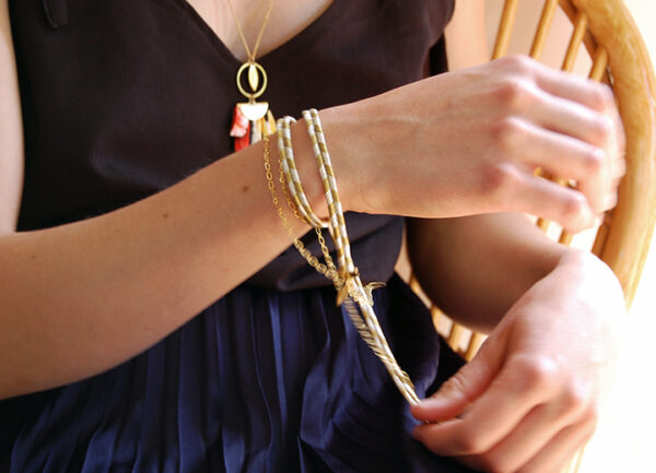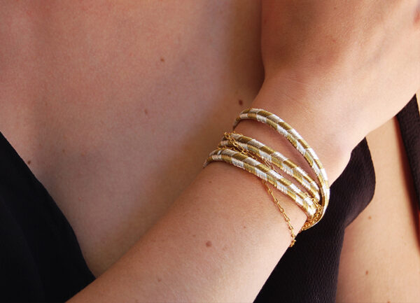 Bracelet Annabelle or et argent modulable L’Orangerie Bijoux – Bijou modulable, passementerie fils d’or et d’argent de la maison Camus, chaines laiton doré à l’or fin 24 carats, bracelet 3 tours ou bijou de tête, – A porter soit en bracelet à enrouler autour du poignet, soit en bijou de tête, 57 cm de long, chaîne de réglage longueur 8 cm, réglable de 48 à 57 cm, fermoir mousqueton – Bracelet ou bijou de tête.