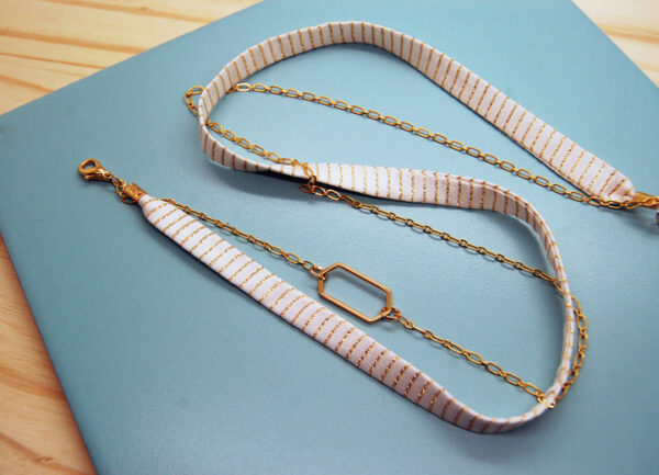 Bracelet Eos soie ivoire et or modulable L’Orangerie Bijoux – Bijou modulable, soie ivoire et or, chaines laiton doré à l’or fin 24 carats, bracelet 3 tours ou bijou de tête, – A porter soit en bracelet à enrouler autour du poignet, soit en bijou de tête, 57 cm de long, chaîne de réglage longueur 8 cm, réglable de 48 à 57 cm, fermoir mousqueton – Bracelet ou bijou de tête.