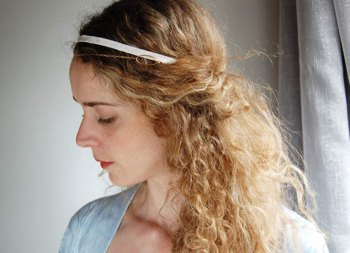 Bijou modulable, soie lyonnaise blanche tissée ton sur ton motif floral et or, chaines laiton doré à l’or fin 24 carats, bracelet 3 tours ou bijou de tête, – A porter soit en bracelet à enrouler autour du poignet, soit en bijou de tête, 57 cm de long, chaîne de réglage longueur 8 cm, réglable de 48 à 57 cm, fermoir mousqueton – Bracelet ou bijou de tête.