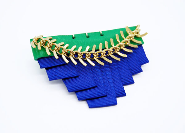 Plissage textile bleu électrique, cuir vert, chaîne laiton dorée à l’or fin 24 carats.