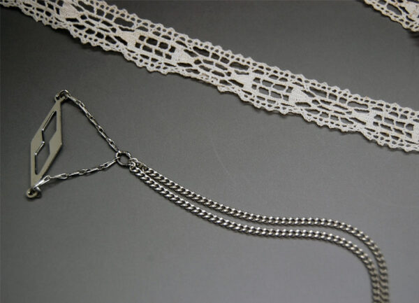 Headband bijou de dos mariage rétro Ingrid, réglable, dentelle du Puy blanc cassé 1,5 cm de large , finitions cuir agneau blanc cassé, jeu de chaines laiton argent, réglable de 52 à 61 cm, chaine et estampe géométrique , longueur 20 cm, à faire tomber sur le côté ou milieu dos, fermoir mousqueton.