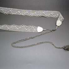 Headband dentelle bijou de dos mariage Elphège, réglable, dentelle du Puy blanc cassé 2cm de large , finitions cuir agneau blanc cassé, jeu de chaines laiton argent, réglable de 52 à 61 cm, chaine et pompon argent , longueur 20 cm, à faire tomber sur le côté ou milieu dos, fermoir mousqueton.