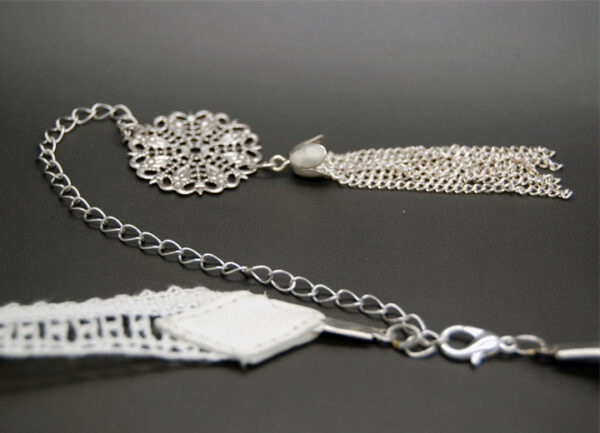 Headband mariage rétro vintage Gabrielle, réglable, dentelle blanche, finitions cuir agneau blanc, réglable de 52 à 61 cm, chaine et pendentif estampe pompon argent à faire tomber sur le côté ou milieu dos, fermoir mousqueton.