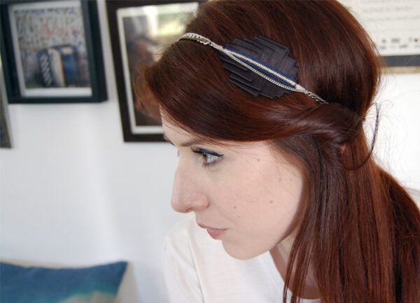 Headband noir design Andrea, bijou créateur, réglable, jeu de chaines laiton argent et bronze, plissage noir et tresse bleu nuit et blanche, réglable de 52 à 61 cm, chaine et pendentif perle bronze à faire tomber sur le côté ou milieu dos, fermoir mousqueton.